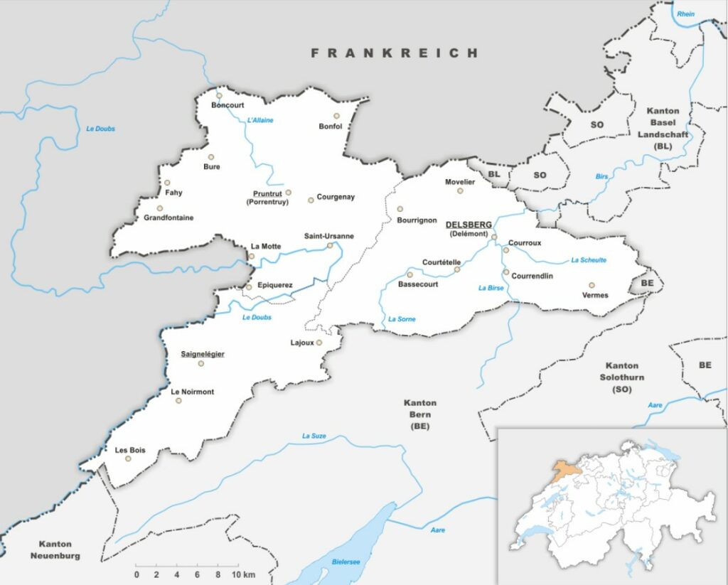 Jura Karte oben erstelllt mit © OpenStreetMap-Mitwirkende + ch-info.ch – klick zur Karte Jura zoombar